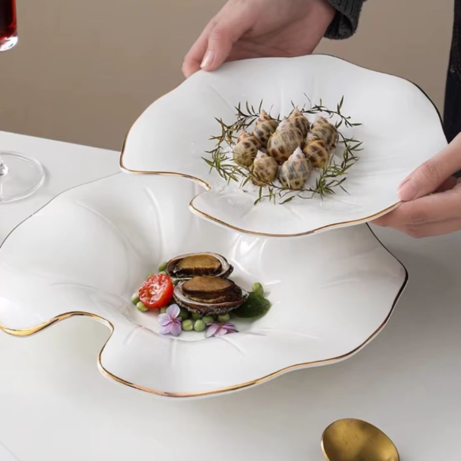 Lotus Edge Ceramic Plate - White with Gold Trim